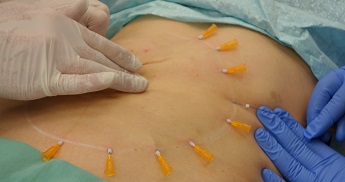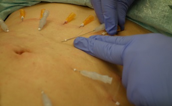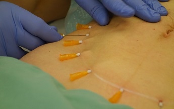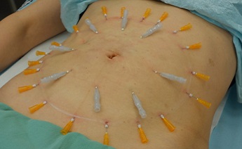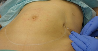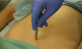 Fota 5,6: Aplikace dlouhých devíti centimetrových hladkých nití s vodičem - jehlou okolo pupku.