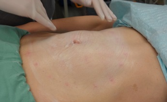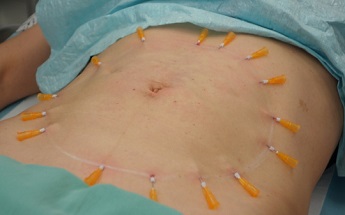 Po liposukci s velkým efektem a po jehličkové radiofrekvenci s efektem minimálním lékařka pro povolenou kůži břicha s drobnými striemi volí umístění hladkých nití do oblasti v okolí pupku.