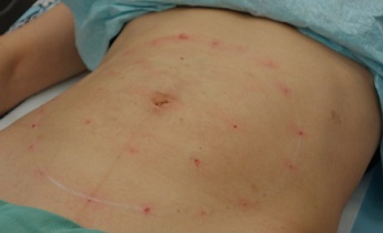 Břicho naší pacientky po druhém porodu pokrývala vrstva tuku, která nejen že nereagovala na jakékoliv cvičení, ale navíc bránila zpevnění uvolněného přímého břišního svalu. Po počáteční laserové liposukci s odsátím neuvěřitelných 700 ml tuku se situace značně zlepšila, nedokonalosti kůže se však projevily jako výraznější. K jejich úpravě byla zvolena jehličková radiofrekvence. Tedy neinvazivní zákrok – bez jehel. Jednalo se pro pacientku v této oblasti o velmi bolestivý zákrok, charakterizovala jej jako mnohem horší než užití jehly. Navíc výsledek po 3 návštěvách nebyl příliš výrazný. Proto se lékařka odhodlala k účinnějšímu řešení, které nestálo více než 2 třetiny ceny frakční jehličkové radiofrekvence, a to k umístění hladkých nití do kůže břicha.