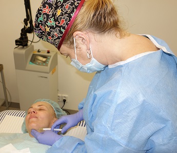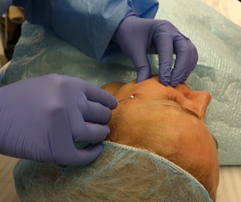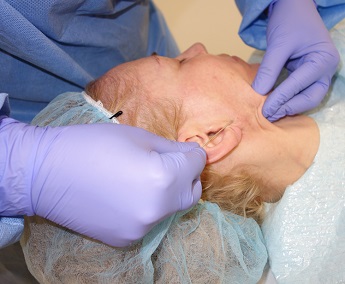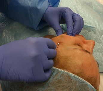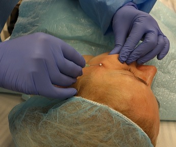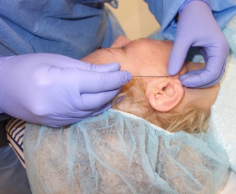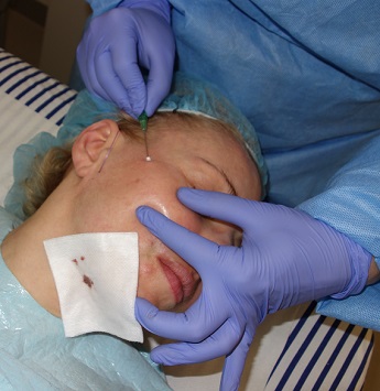 Foto 6,7: Vlevo osušení obličeje po aplikaci anestezie, vpravo zavedení vodiče s dlouhou liftingovou nití do kůže pro vymodelování dolní čelisti, zvednutí dolní části obličeje