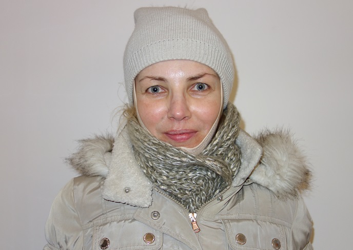 Foto 39-44: Trojice fotek (bez mimiky, v mírném úsměvu a v plném úsměvu). Vlevo stav před zákrokem, vpravo 3 týdny po zákroku. Obličej na fotkách vlevo působí mnohem unaveněji než na fotkách vpravo, kde vypadá mladší a čerstvější. Je to dáno hlavně nadzvednutím čelní oblasti, tím došlo k pozvednutí očních víček. V oblasti dolní čelisti sledujeme mírné pozvednutí valů na okrajích brady směrem vzhůru. Linie dolní čelisti tak doznala pravidelnějšího a hladšího tvaru (foceno v amatérských podmínkách bez nalíčení a retuše).