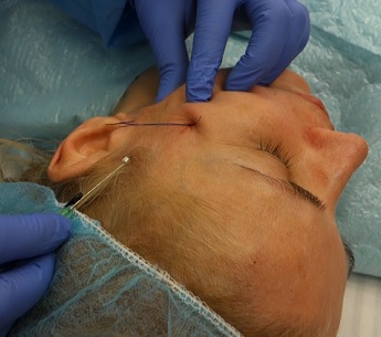 Foto 12,13,14: Zavedení 3 krátkých nití s vodičem přes kůži pro zvednutí střední partie obličeje směrem nahoru a k uchu