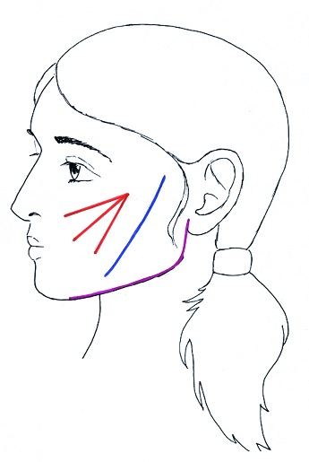 Zavedení tří kratších (červené) a jedné středně dlouhé nitě (modrá) do oblasti tváře v rozsahu od hrany nosu po nejvýraznější a nejvystouplejší bod tváře nad jařmovým obloukem. Jedna delší niť (fialová) byla zavedena podél hrany dolní čelisti.