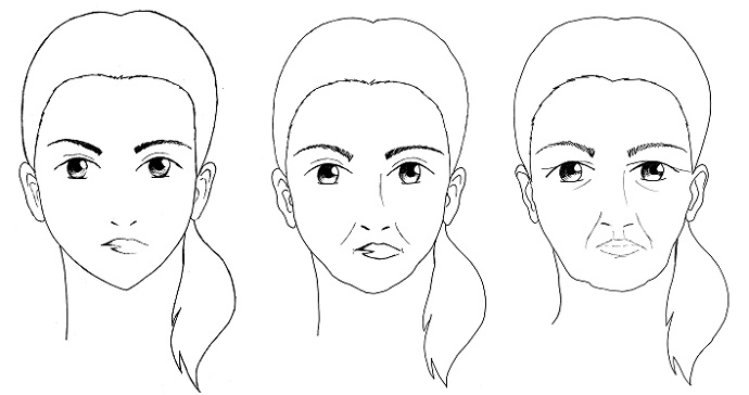 Foto: Gravitační ptóza – pokles obličeje působením gravitace postupem času (věk: první schéma cca 30, druhé schéma 45+, třetí schéma 55+)