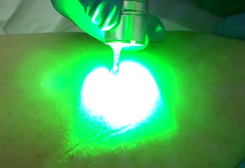 Foto 9-14: Na sklerotizaci navazuje laserové ošetření drobných cévek, které není možné jehlou zajistit, a to pro velmi malý průsvit.