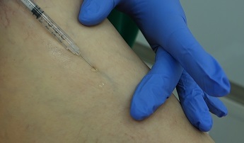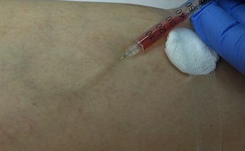 Foto 1-8: Vlevo stav před sklerotizací dané cévy, vpravo po vpravení sklerotizující látky do cévy. Na poslední fotografii má lékařka kontrolu, že je v žíle. A to v podobě ze žíly nabrané krve do stříkačky se sklerotizující látkou.