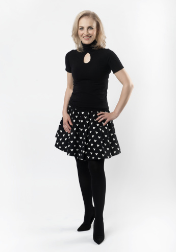 U sukní jsem se také nenechala odbýt tím, že mně nesluší a jednu vlastní s Mickymousem si přinesla. Tedy ne mou, ale půjčuje mně ji dcera Sophie na taneční lekce. I když poslední dva týdny jsem ji přestala vracet, není po ní poptávka, tak už je zřejmě moje :-). Tuto kombinaci uvítají ženy, které musí z různých důvodů nosit stahovací punčochy. Právě s těmi jsme model nafotili. Jak vidíte, i zdravotní doplněk se dá začlenit do elegantního modelu.