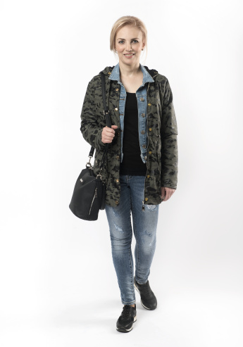 O chladnějších večerech můžeme na džínový komplet přidat bundu s maskáčovým vzorem.