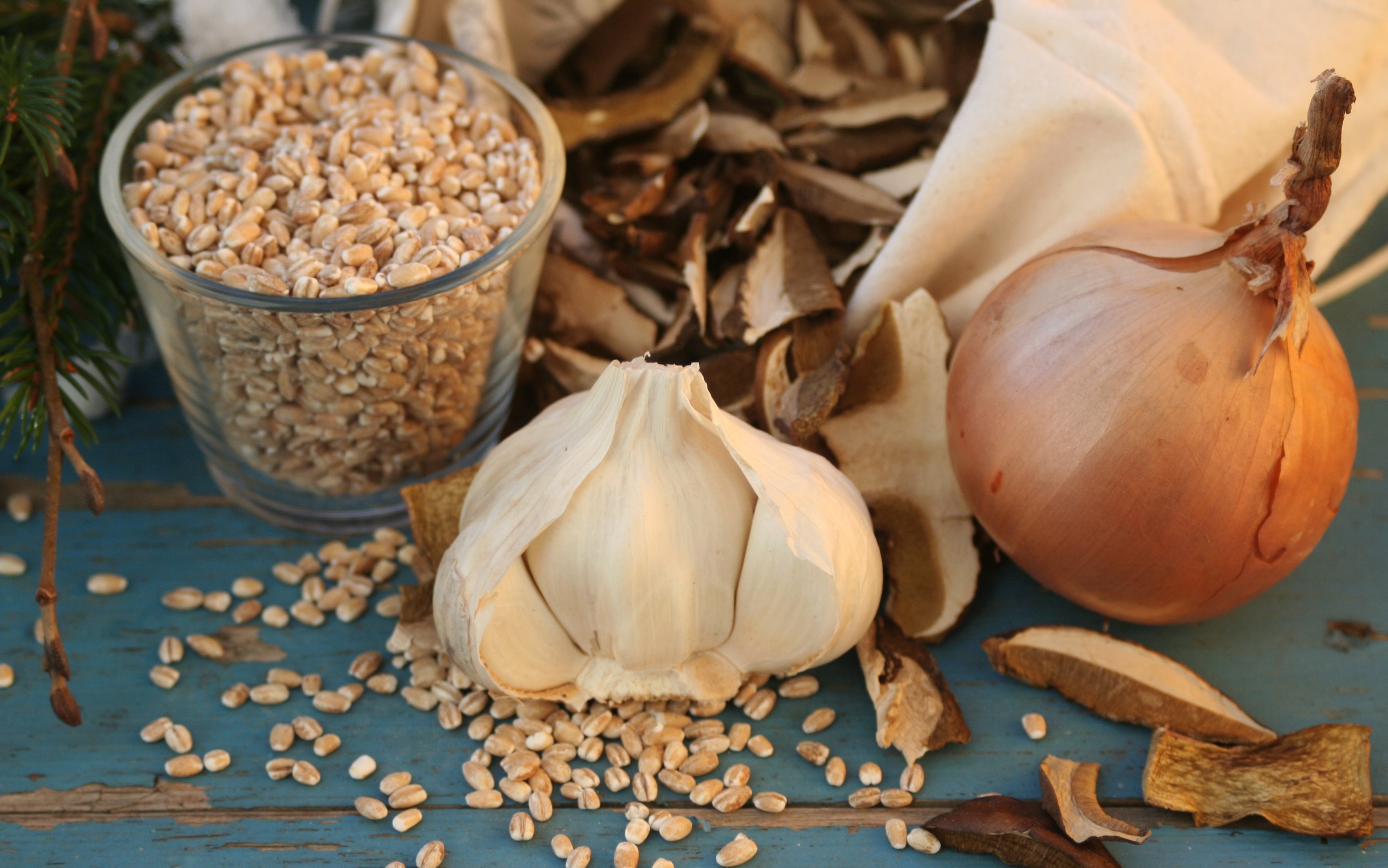 1. Základními tradičními surovinami jsou kroupy, sušené houby, cibule, česnek a domácí vepřové sádlo.
