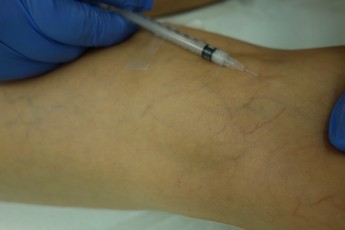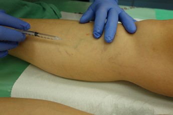 Fota 3-4: Postupné vstřikování sklerotizující látky do žilek v oblasti stehna, u fotky vpravo je patrné vymizení žíly po vstřiknutí sklerotizující látky.