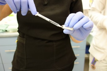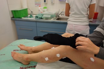 Fota 5-6: Vstřiknutí látky do žilky v oblasti lýtka a komprese - stlačení místa aplikace prstem lékařky.