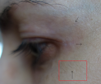Foto 17-18: Růst tmavých chloupků kolem oka při používání séra Hair plus.